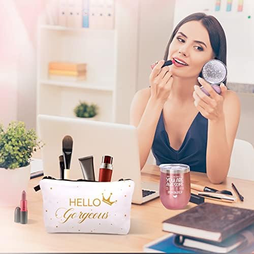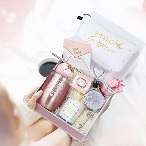 ❤ 【BUY WINE GIFTS FOR HER SPA NIGHT】Each basket contains: 1 x 12 oz insulated stainless steel wine tumbler with the words” YOU ARE AWESOME”, 1 x Quicksand Mirror, 1 x Rose Essential Oil bar soap, 1 x Rose bath bomb, 1 x Gardenia Candle, 1 x Leakproof Lid,1 x Wine Bottle Stopper,1 x Key Bottle Opener, 1 x Reusable straw with cleaning brush,1 x Cosmetic bag, 1 x Small Rose bouquet, 1 x Roes Greeting card (Write your blessings), 1 x Gift Box.