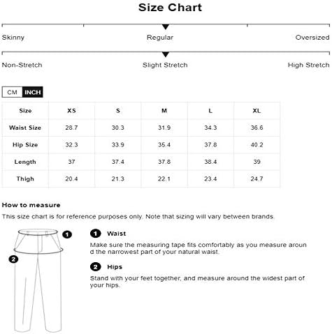 S: Waist Size: 30.3”, Hip Size: 33.9”, Length: 37.4”, Thigh: 21.3”,