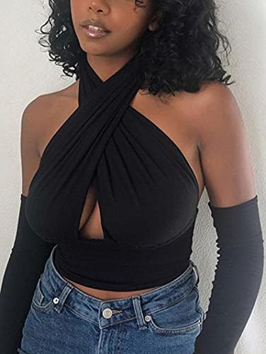 Features: Sexy cross wrap open back cropped shirt for women, feature with cross halter neckline, stylish cut out front design, with sleeves, open back, sleeveless cropped top